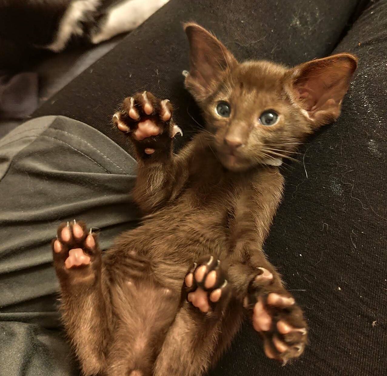 Petite bouille curieuse, aime l’aventure mais pas trop loin de nous, finit toujours par venir se poser pour se faire câliner et finir par s’endormir. Joueur et coquin, adore les gratouilles sur le ventre pattes en l’air.